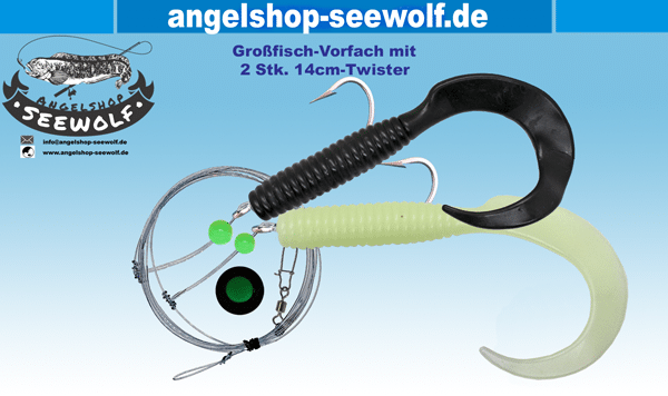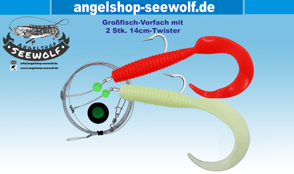 14cm Dorsch-Vorfach Edelstahl-Haken 8/0 Pilksystem mit 2 Großfisch-Twistern feuerrot fluo schwarz 58KG Schnur 60KG Wirbel